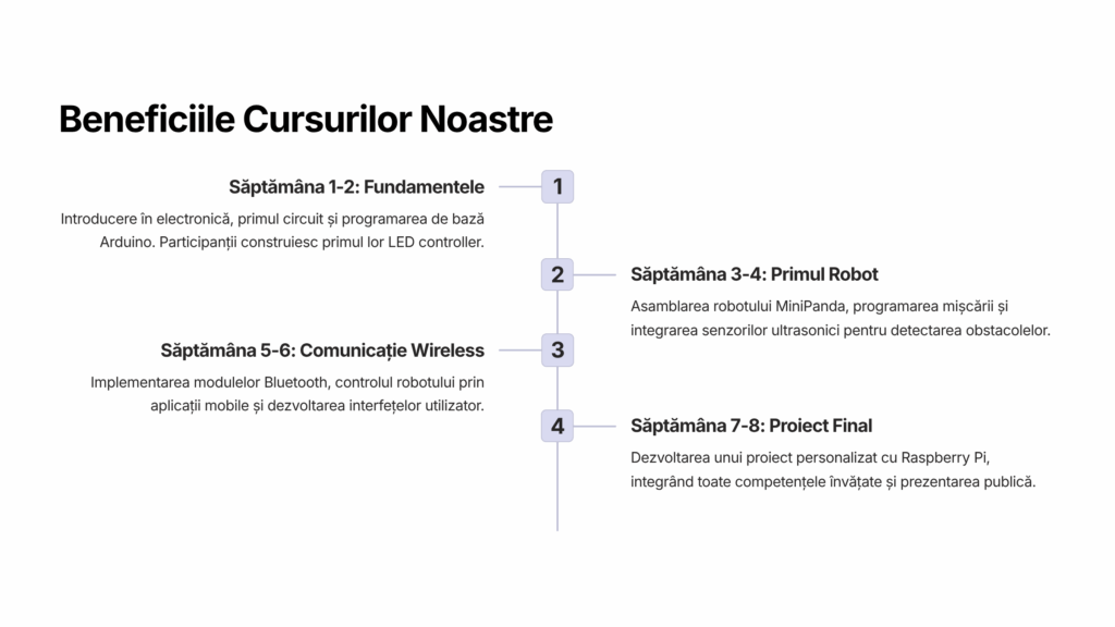 Cursurile noastre de robotică oferă o educație STEM completă, adaptată pentru toate vârstele și nivelurile de experiență. De la concepte fundamentale la proiecte avansate cu inteligență artificială.